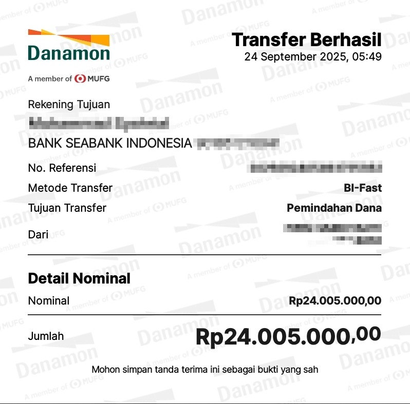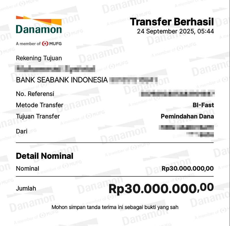 Pilihan Bank : BCA, BRI, BNI, MANDIRI, DANAMON, PANIN, CIMB Niaga, PERMATA, BSI, BJB, BluBCA, Maybank, Neo Commerce, Papua & SEABANK